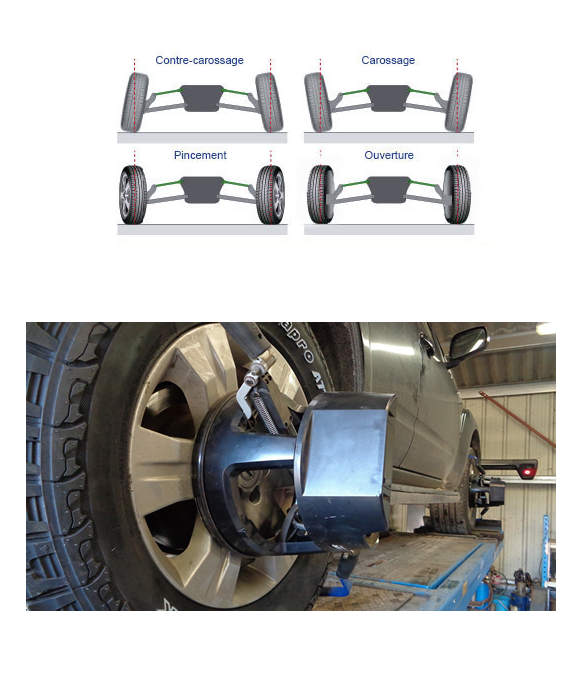 Notre machine 3D Laser dernière génération réaliseront plusieurs vérifications basées sur les recommandations des constructeurs automobiles pour réaliser le contrôle de la géométrie : la chasse, l'inclinaison de pivot, les angles inclus et ouverts, le carrossage, l'angle de poussée arrière et le parallélisme.